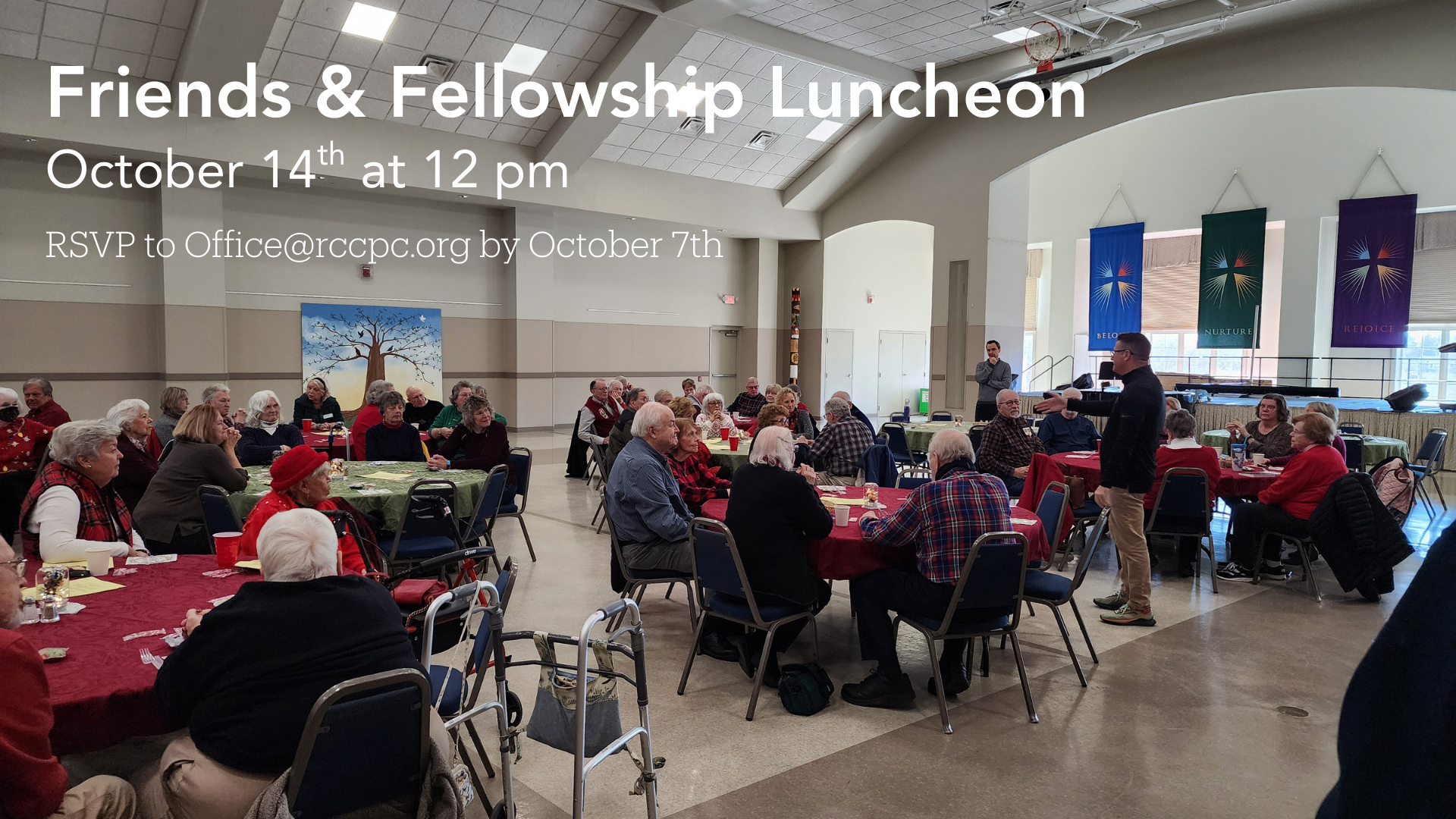 We invite all to join us the 2nd Tuesday of each month (October, November, December, March, April, May) for this special time of fellowship with church staff and friends. Join us in Founders Hall at 12 noon for a delicious catered lunch. Reservations are required. Contact office@rccpc.org. or call 302.998.0434 to RSVP.