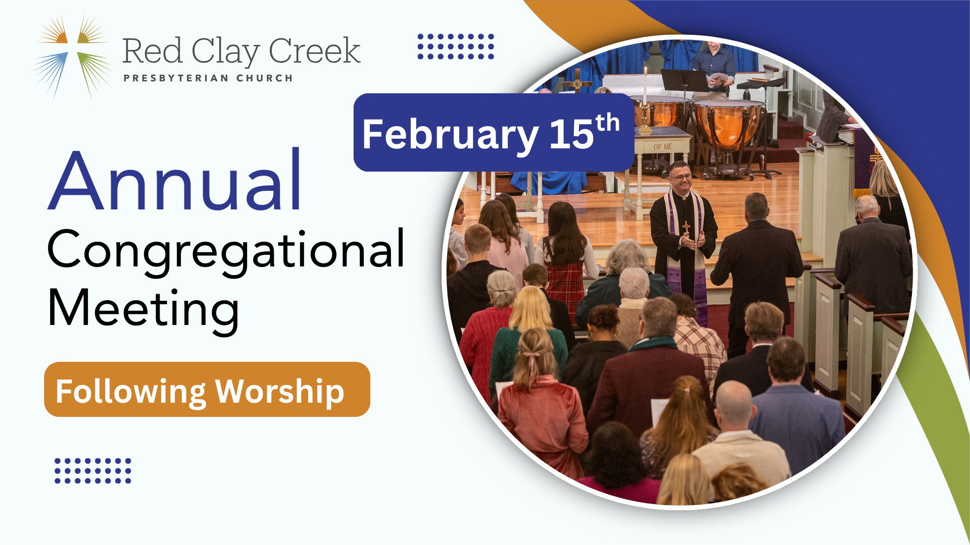 The Annual Congregational meeting will be held immediately after the 10:00 a.m. worship service on February 15, 2026 for the purpose of receiving the reports of the Staff, the Clerk of Session, Session Committees, the Board of Deacons and other church organizations and committees, receiving and acting upon the report of the Nominating Committee for the election of ruling elders, deacons and members of congregational committees, reviewing the 2026 operating budget, and any other business deemed appropriate for congregational consideration.